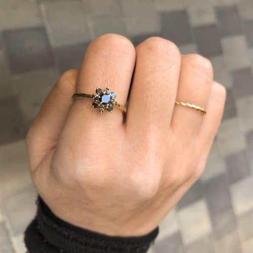 טבעת פרח מרשימה מיוחדת ומנצנצת, משובצת יהלומים שחורים.