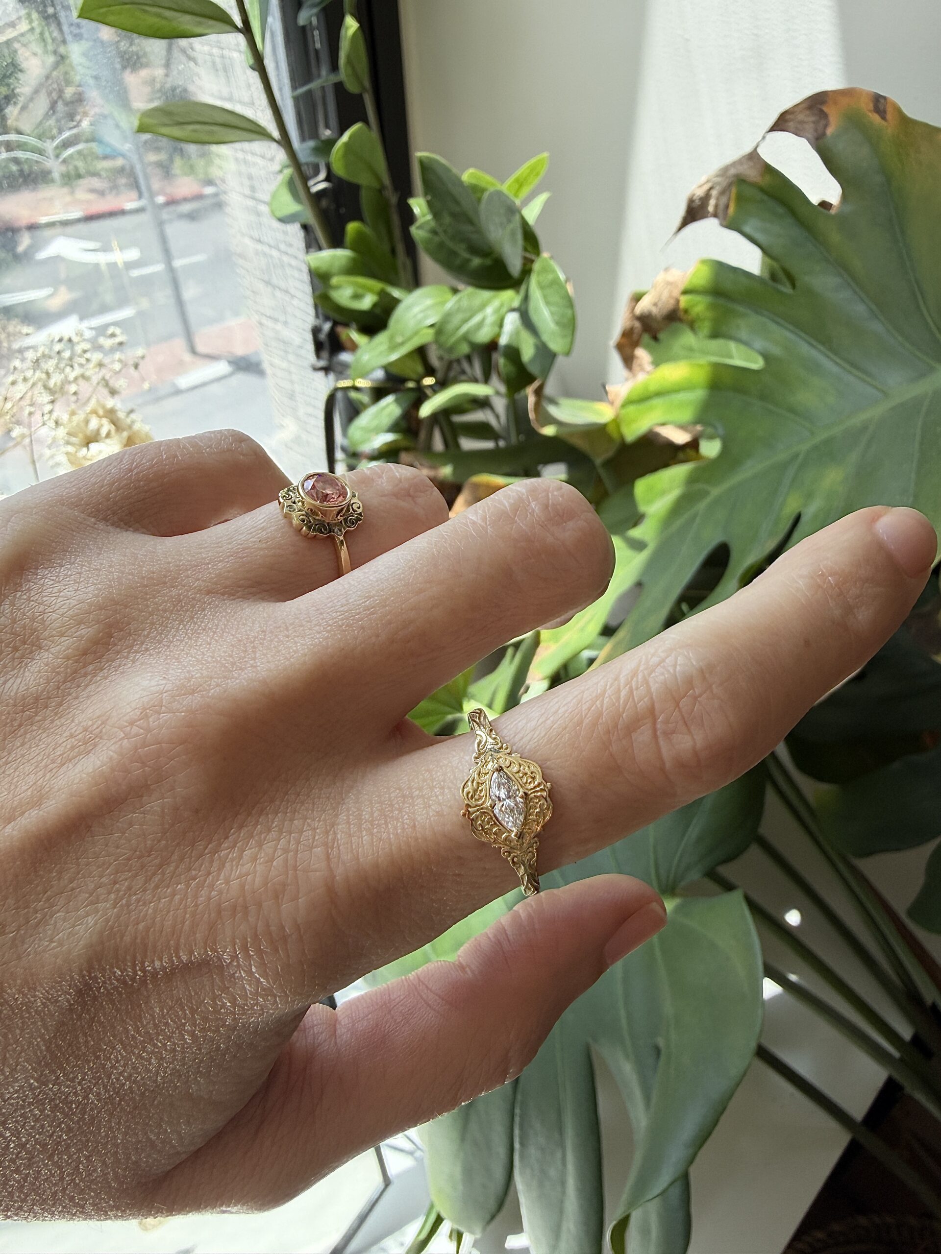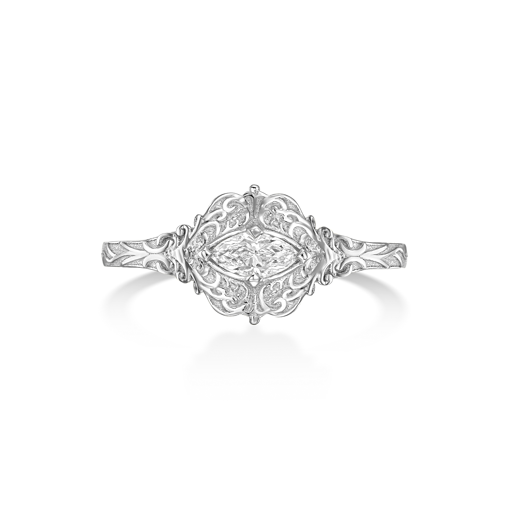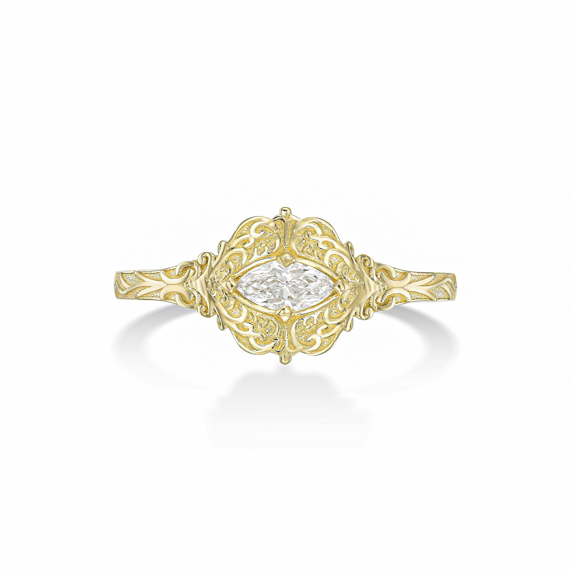 המרקיזה כאן מונחת בצורה אופקית, כשהציר המאורך שלו נחתך על ידי מבנה סימטרי שמקיף אותו משני הצדדים בחירה שמדגישה את הצורה שסביב בניתי מסגרת שמורכבת מאלמנטים פתוחים וסגורים, עם עבודת זהב עדינה שמרגישה כמעט כמו תחרה של זהב.
