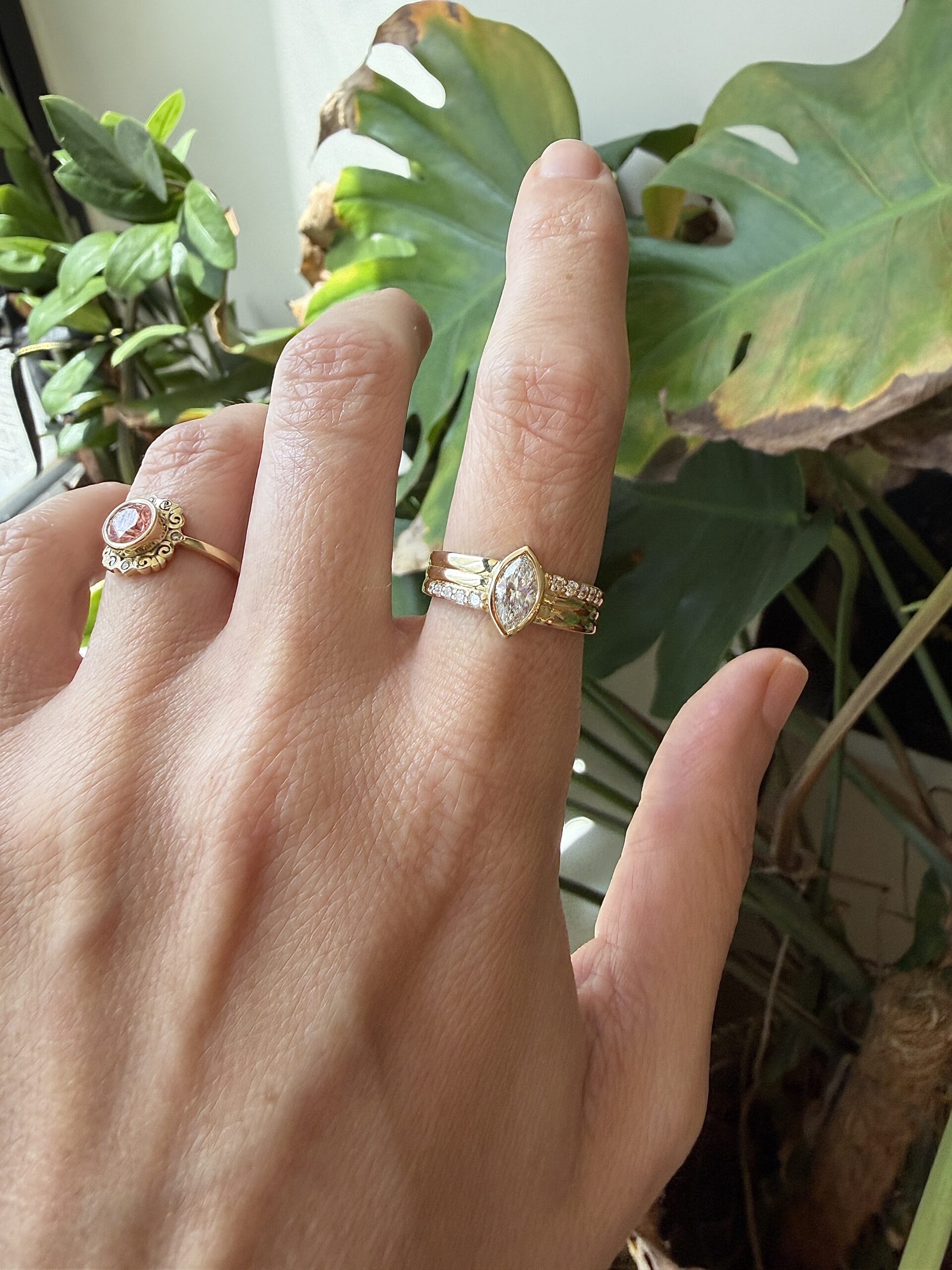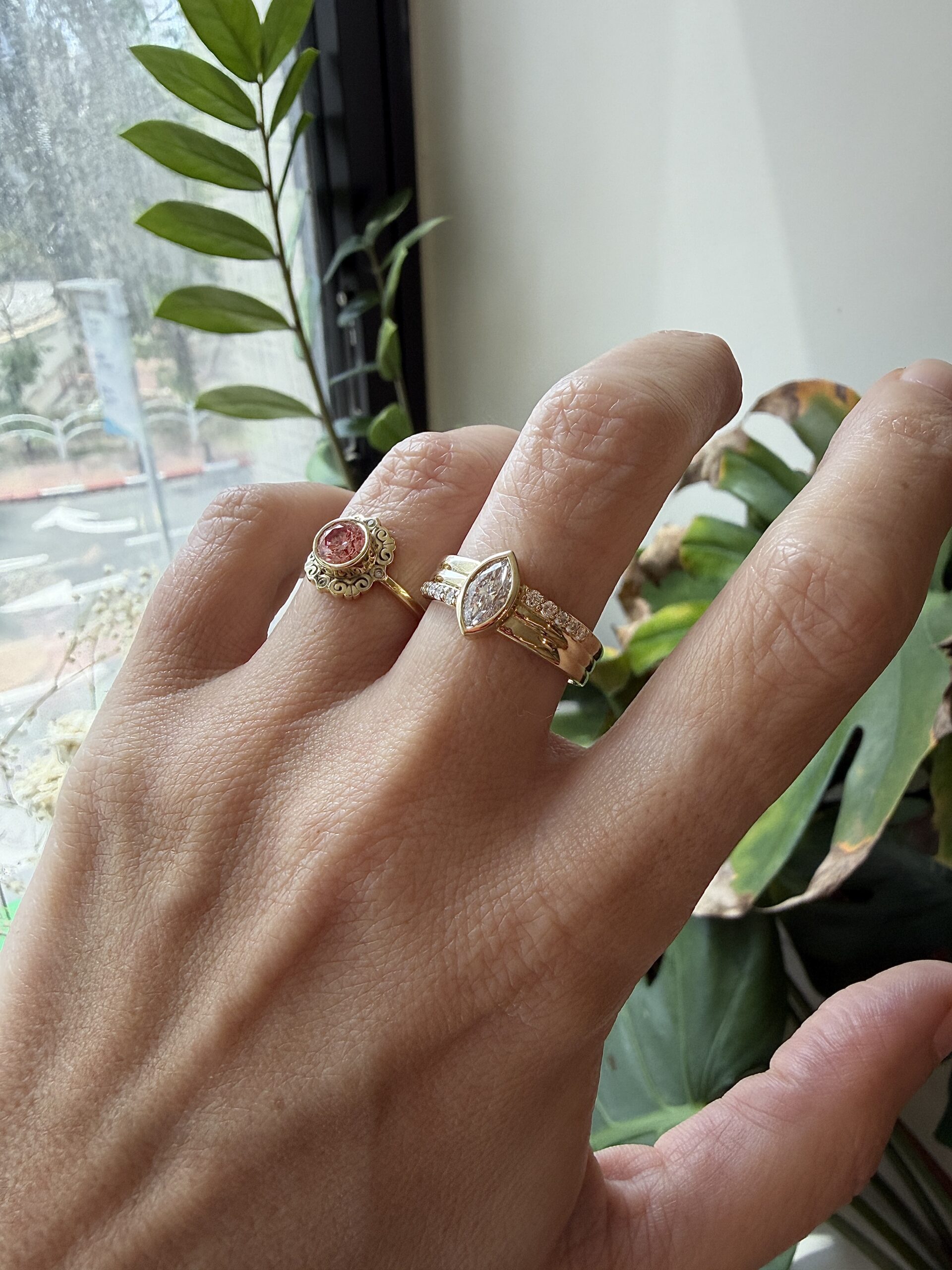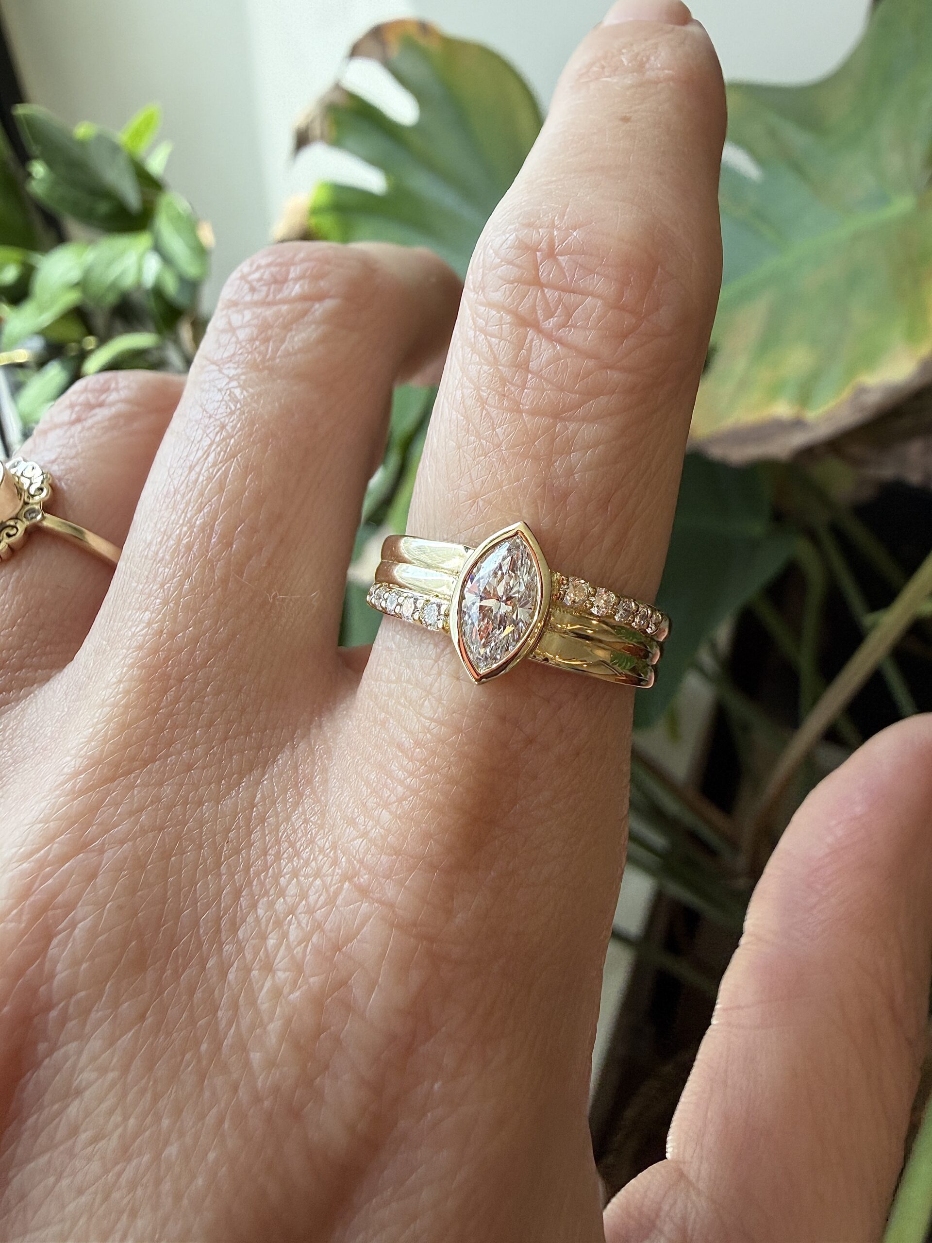 טבעת עם יהלום מרקיזה מרכזי שמשובץ במסגרת זהב עדינה שאני כל כך אוהבת, זה פשוט מדגיש את הצורה המאורכת והחדה שלו, וממקמת אותו כציר המרכזי של כל המבנה. סביבו בניתי טבעת שמורכבת משכבות לא כטבעת אחת שטוחה, אלא כקווים שמונחים אחד מעל השני, ויוצרים נוכחות מטריפה של זהב.