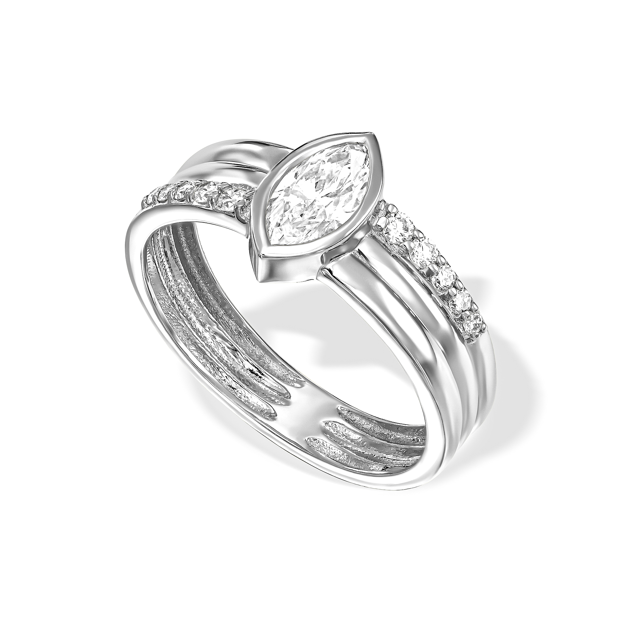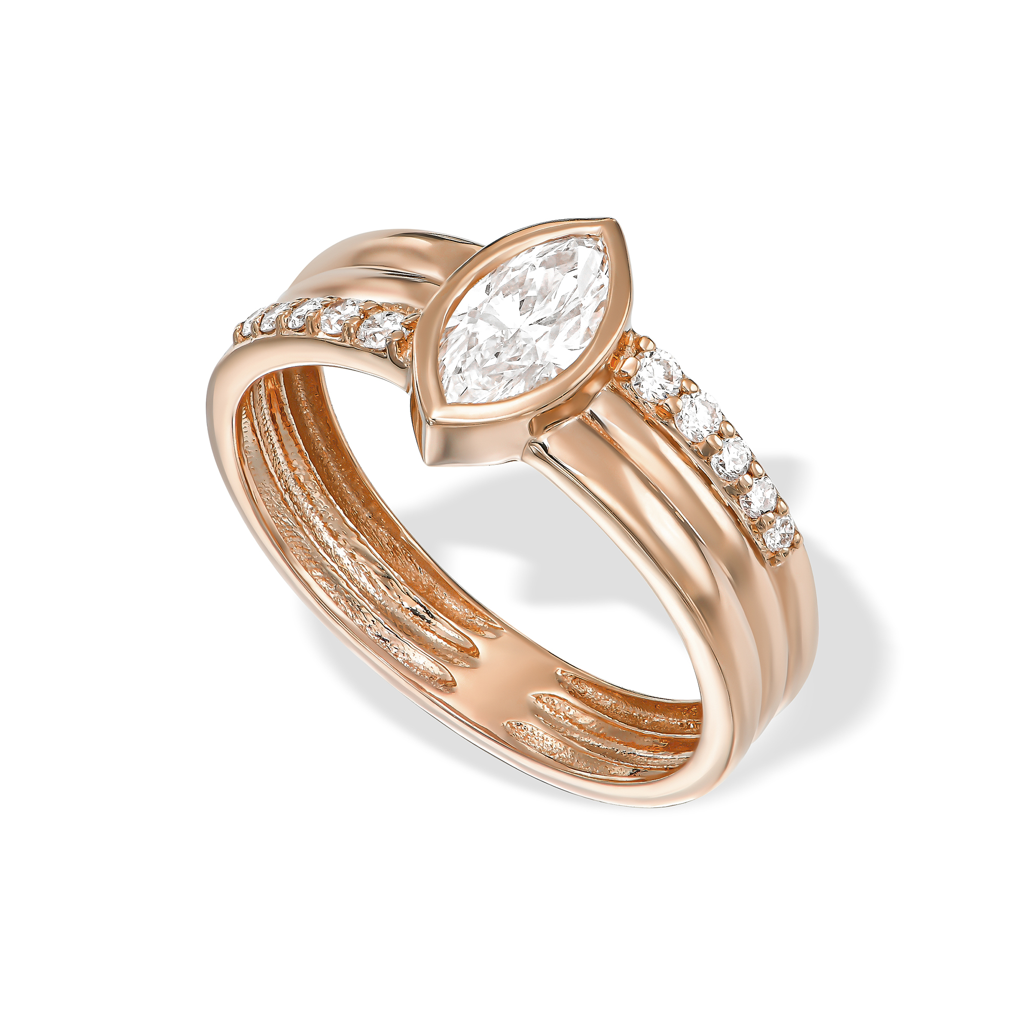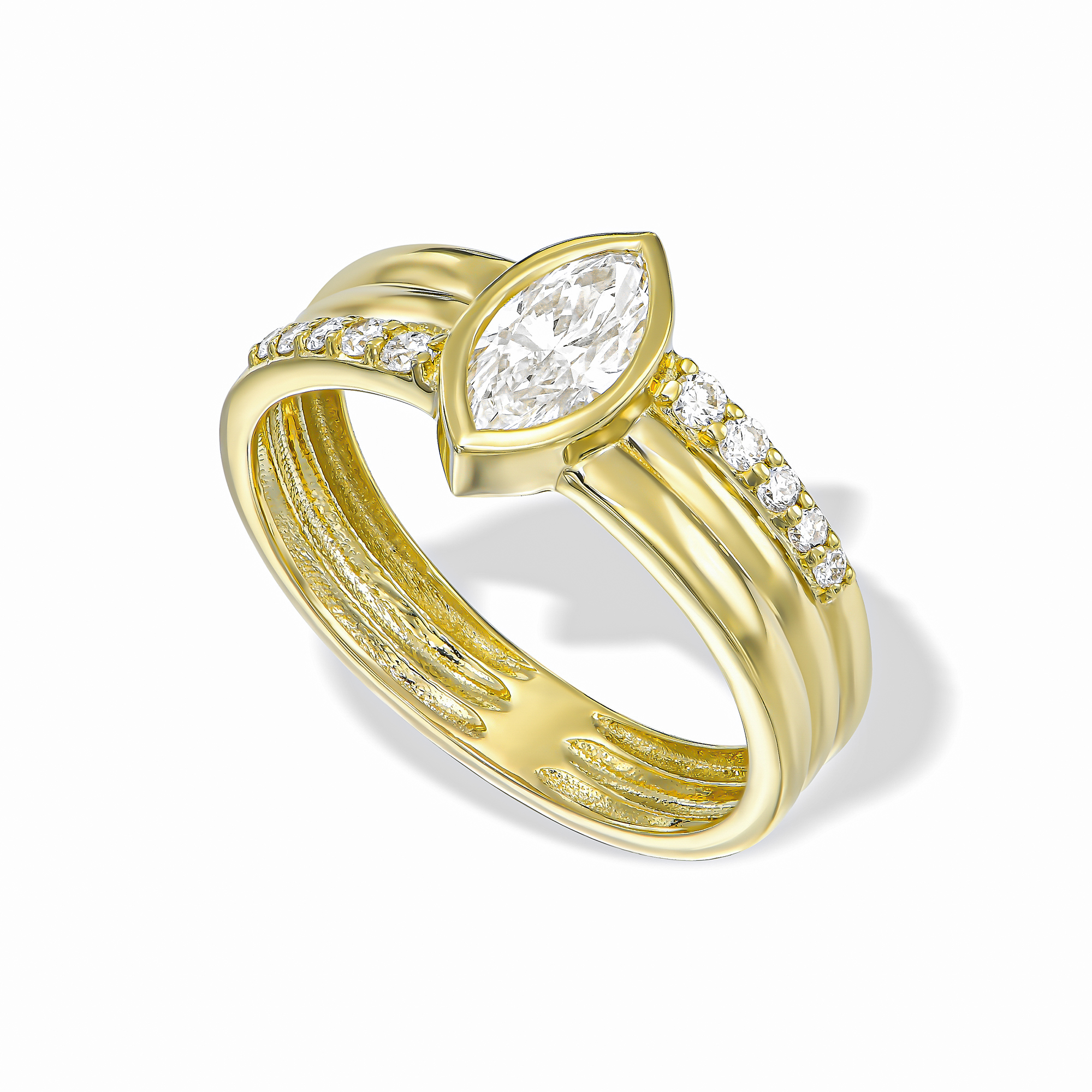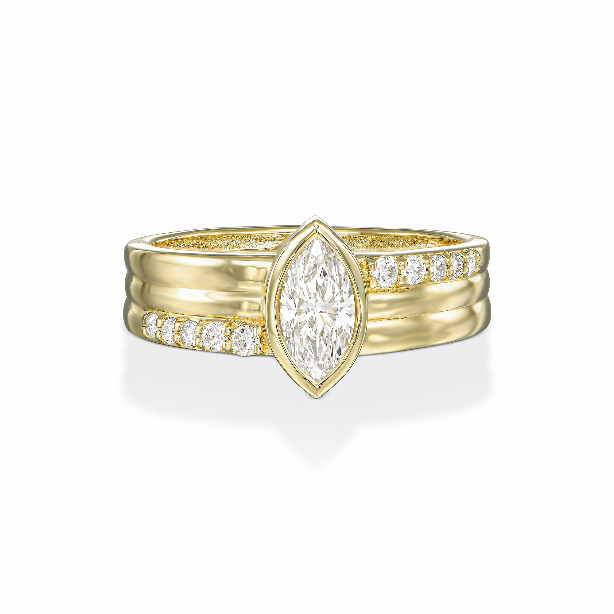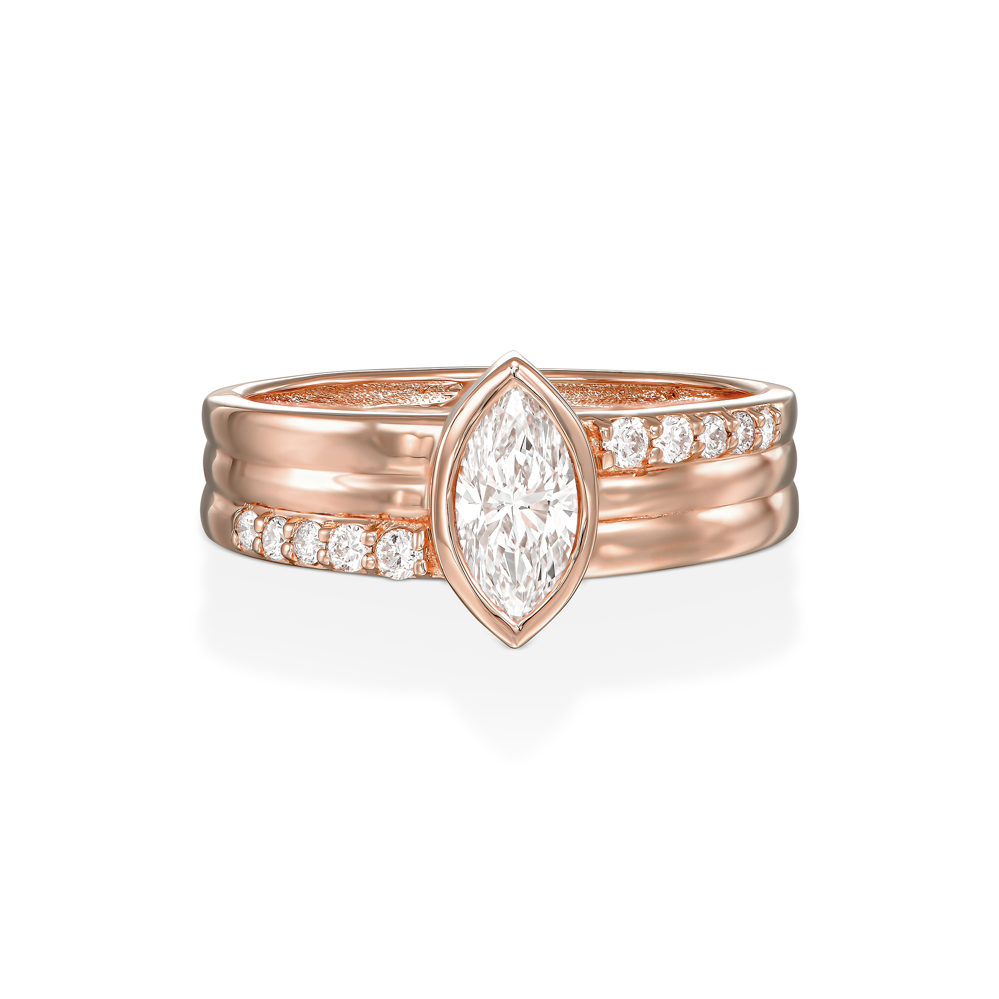 טבעת יהלום מרקיזה על טבעת זהב עבה 3 שורות משובצות יהלומים בצורה לא סימטרית מושלמת