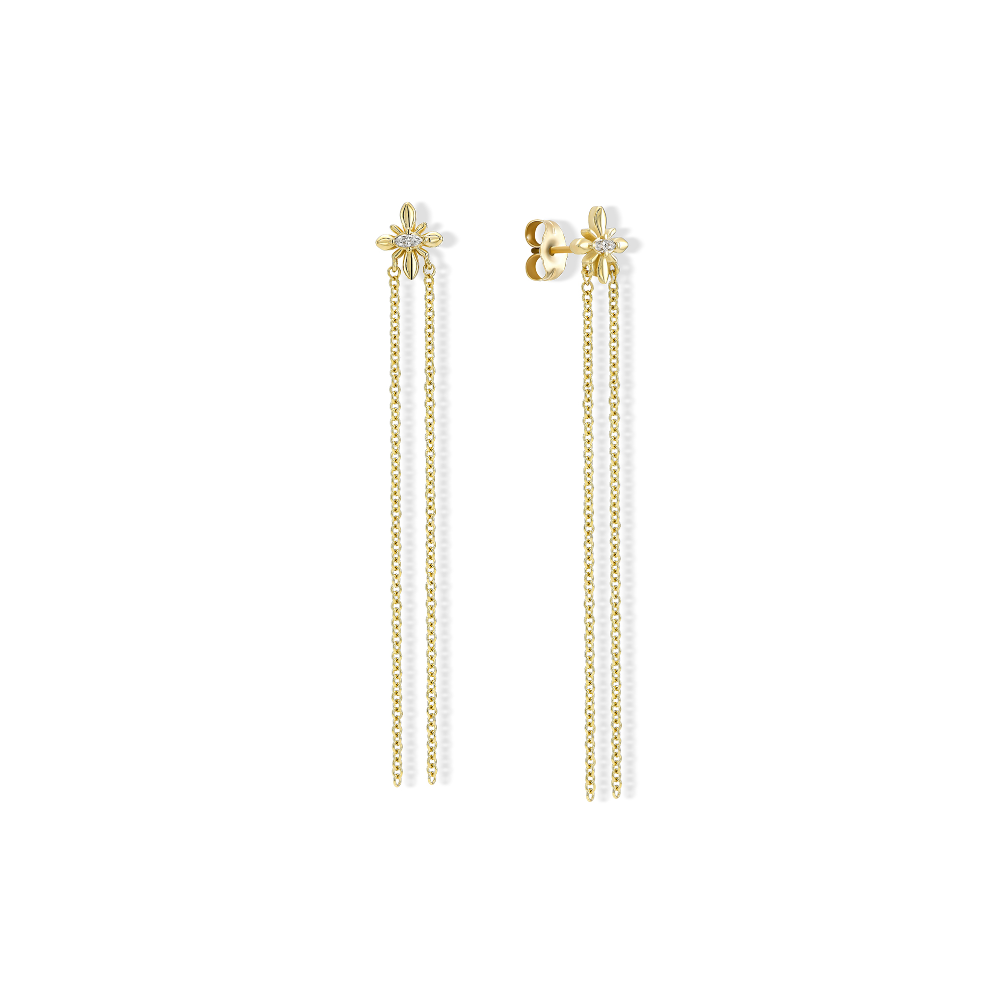עגיל פרח זהב עם יהלום מרקיזה קטן במרכז ו 2 שרשראות נופלות