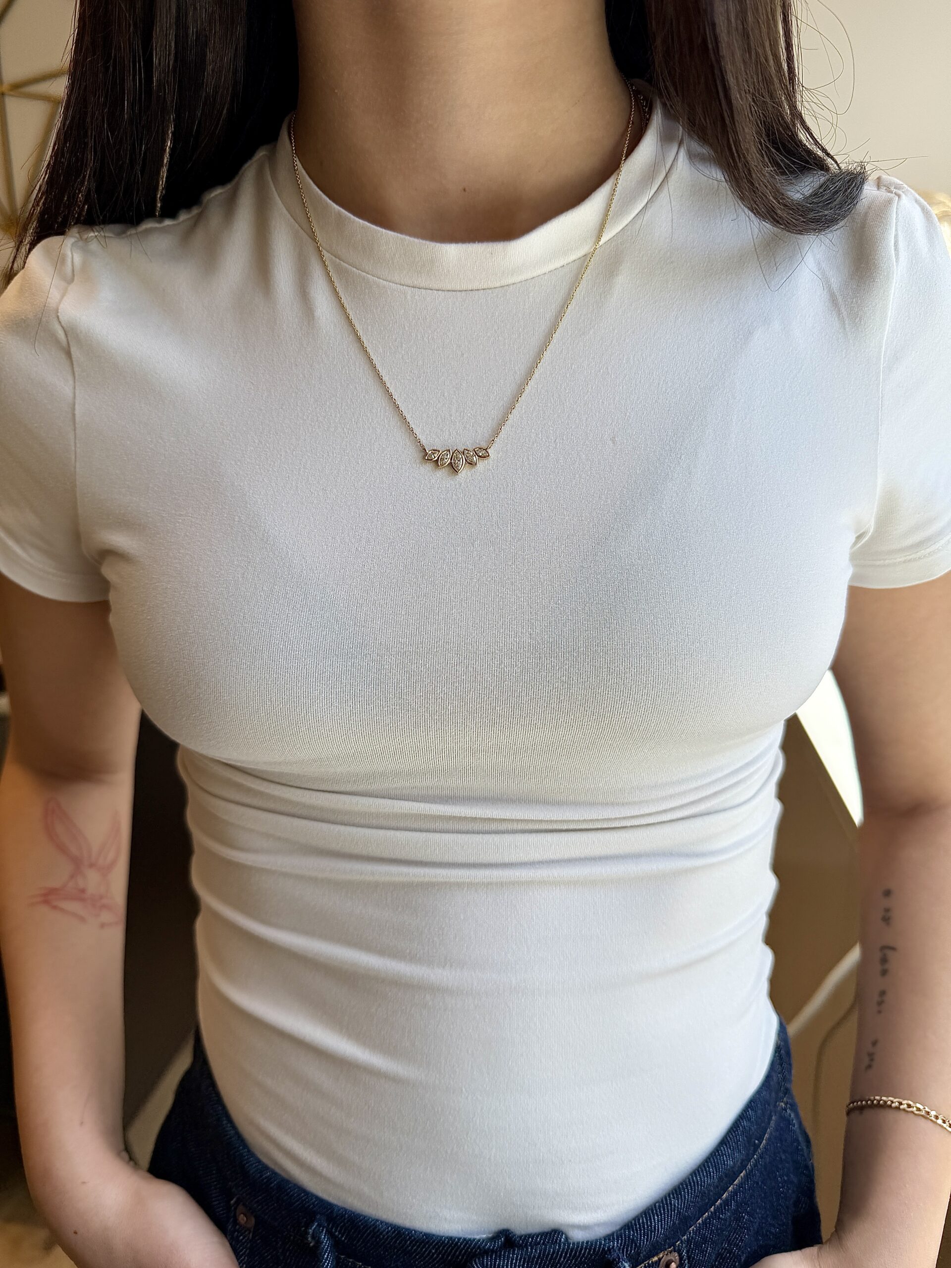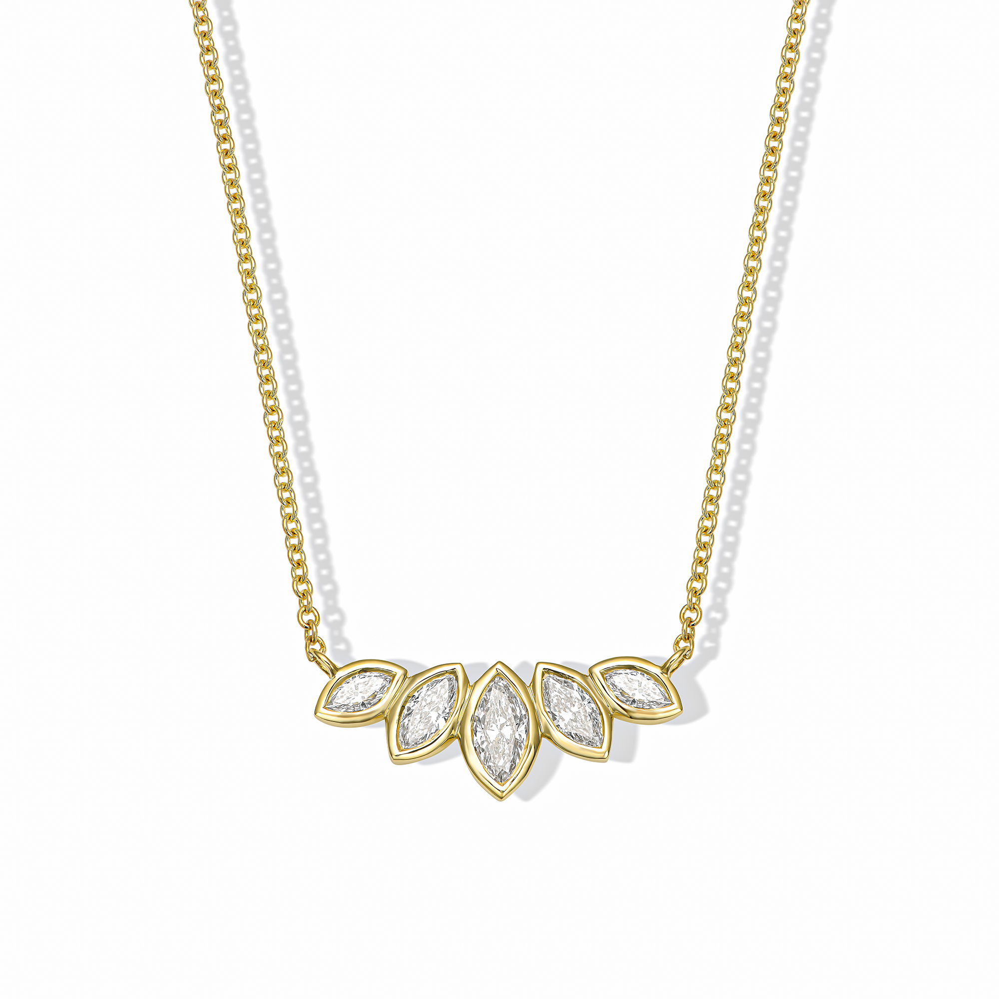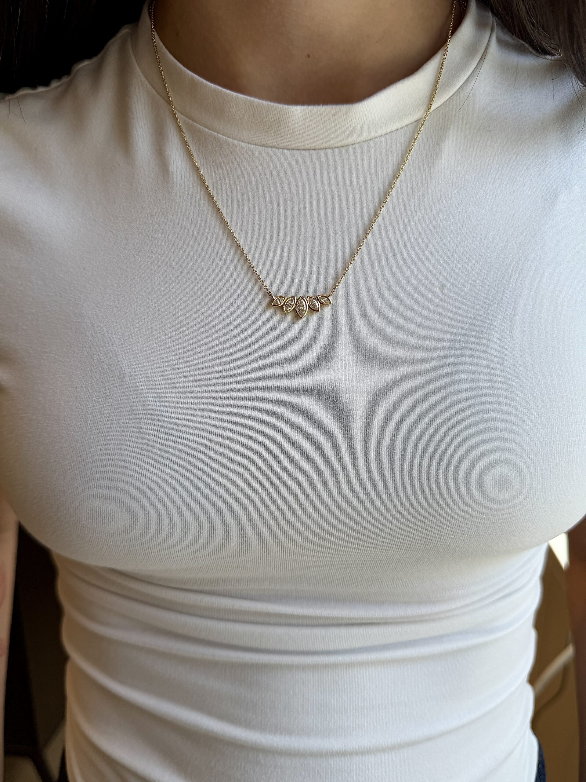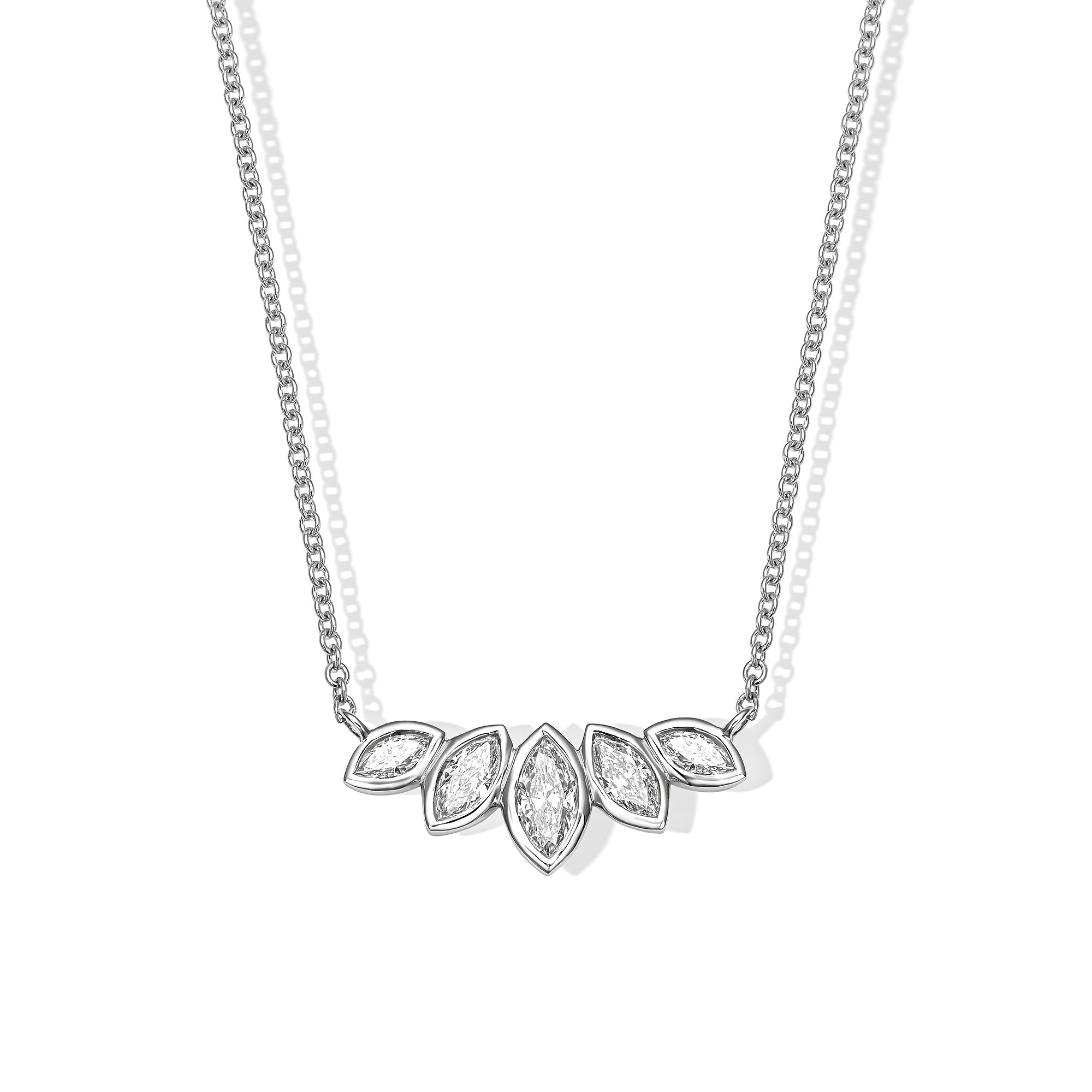 שרשרת עם חמישה יהלומי מרקיזה משובצים לאורך קו אחד, בקומפוזיציה שנפתחת מהמרכז החוצה.